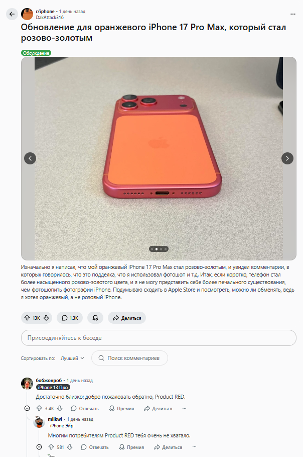 На Reddit набирает популярность пост пользователя DaKAttack316, который рассказал о неожиданном изменении цвета своего оранжевого iPhone 17 Pro Max. После нескольких недель использования смартфон, по его словам, «стал розово-золотым».